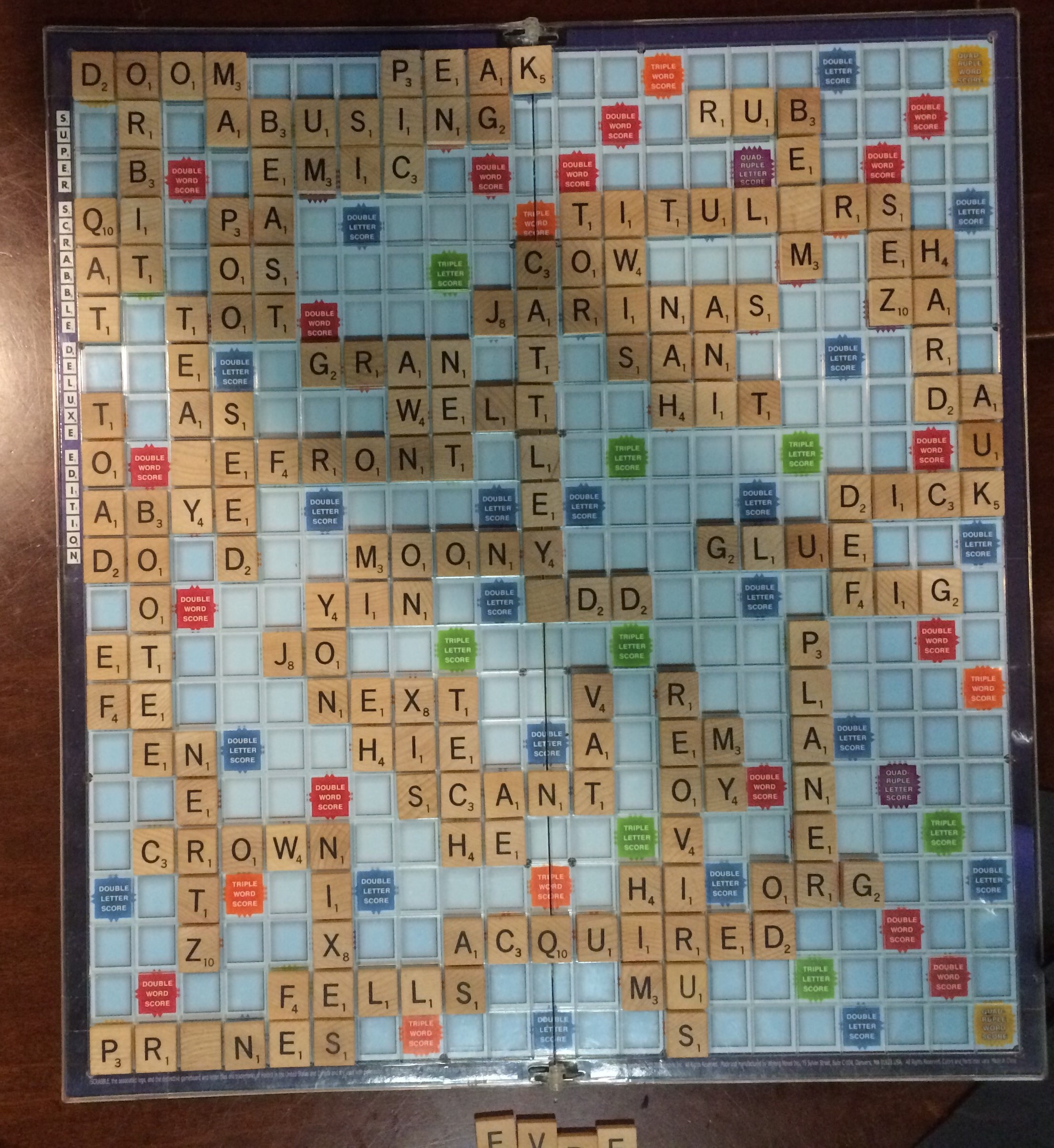 a b c d e f g h i j k l m n o p q r s t u ----------------------------------------- 1|D O O M P E A K = ' $| 2| R A B U S I N G - R U B - | 3| B - E M I C - - # E - | 4|Q I P A ' = T I T U L a R S '| 5|A T O S " C O W - M E H | 6|T T O T - J A R I N A S Z A | 7| E ' G R A N T S A N ' R | 8|T A S W E L T H I T D A| 9|O - r E F R O N T L " " - U| 10|A B Y E ' ' E ' ' D I C K| 11|D O D M O O N Y G L U E '| 12| O - Y I N ' a D D ' F I G | 13|E T " O " " P - | 14|F E N E X T V R L =| 15| E N ' H I E ' A E M A ' | 16| E - S C A N T O Y - N # | 17| C R O W N H E " V E " | 18|' T = I ' = H I ' O R G '| 19| Z X A C Q U I R E D - | 20| - F E L L S M U = - | 21|P R u N E S = ' S ' $| ----------------------------------------- a b c d e f g h i j k l m n o p q r s t u Mike Wolfberg E.B. ----------------------- ----------------------- MOONY 11g 26 26 YIN 12f 16 16 JO 13E 30 56 NEXT 14f 28 44 CATTLEYa k5 63 119 WELT 8h 14 58 HIE 15g 33 152 GRAN 7f 17 75 JARINAS 6J 46 198 SAN 7m 14 89 rEFRONT 9c 80 278 SEED d8 15 104 TEArY c6 32 310 POO d4 17 121 HIT 8n 27 337 BEAST e2 37 158 COW 5k 32 369 SCAN 16h 22 180 TITULaR 4L 74 443 ABUSING 2d 20 200 DOOM 1a 47 490 BOOTEE b10 24 224 EF a13 32 522 SEZ s4 49 273 PEAK 1h 62 584 HE 17i 32 305 EMIC 3e 39 623 BERM r2 26 331 NERTZ c15 36 659 CROW 17b 30 361 trade ? 0 659 VAT L14 15 376 NIX e17 44 703 ORBIT b1 18 394 FELLS 20e 43 746 PRuNES 21a 49 443 HARD t5 40 786 AUK u8 30 473 ACQUIRE 19i 124 910 (ACQUIRE)D 19i 26 499 REOVIRUS 116 116 1026 HIM m18 29 528 trade ? 0 1026 DICK 10r 22 550 GLUE 11o 30 1056 FIG 12r 21 571 trade ? 0 1056 MY n15 27 598 aDD 12k 6 1062 ORG 18p 15 613 TOAD a8 35 1097 PLANER q13 28 641 QAT a4 45 1142 RUB 2p 5 646 (EERV) 14 660 FINAL SCORE 1142 660 (total = 1802)