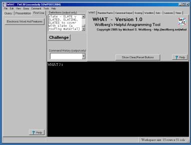 The model of use is there is virtual slate where WHAT "writes" its answers resulting from a query. The contents of the slate remain until another query is made. You can save the slate contents to one of 99 word lists, but this is not a typical need. A query, along with possible filtering, such as words of a certain length, fills the slate with the answer. There is the option to add to the slate instead of replacing its contents. Slate presentation is an independent issue. You have a great deal of control over how the slate is presented.
